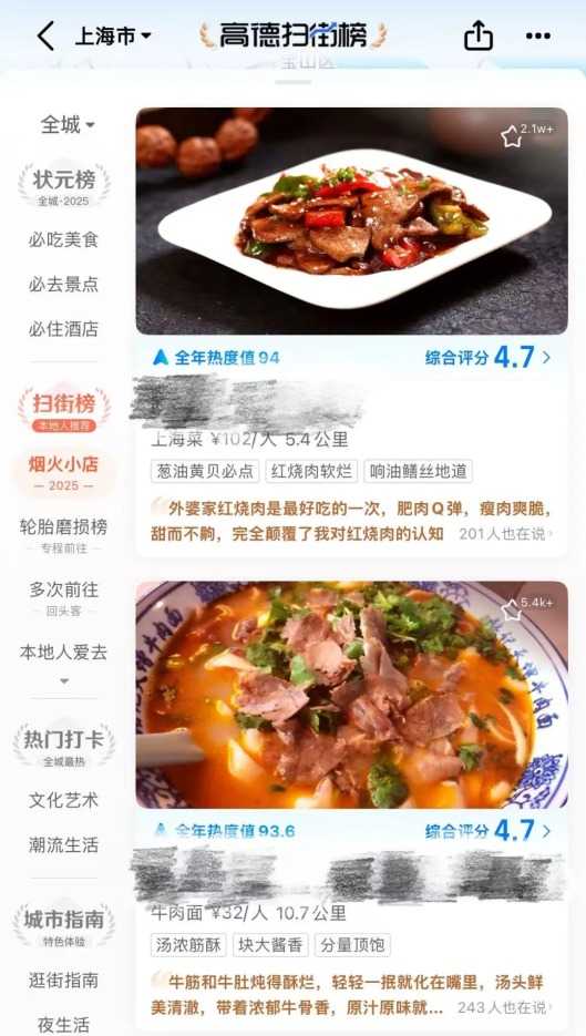 此外,记者发现,目前高德地图App已在首页上线“高德扫街榜”入口,这一商业举措为用户获取美食信息提供了新途径。