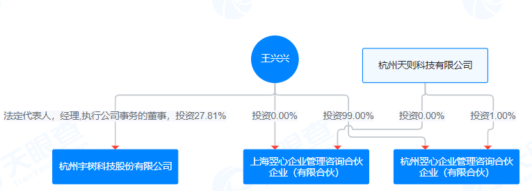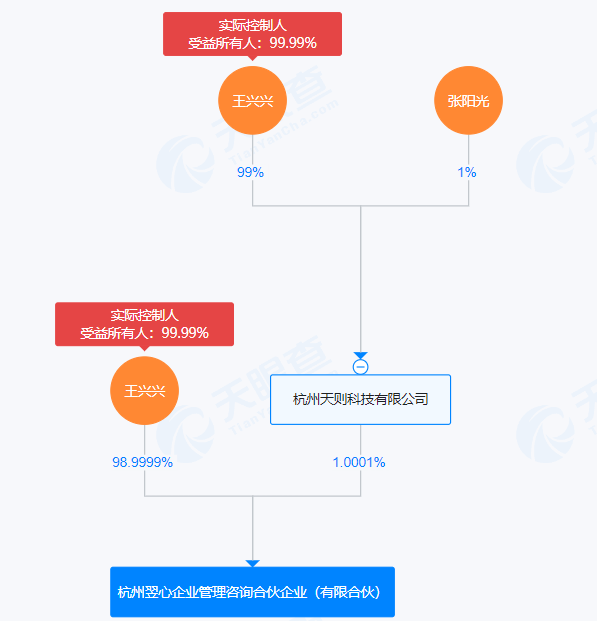 股权穿透可见,上海翌心、杭州翌心的出资人均是王兴兴、杭州天则科技有限公司(以下简称杭州天则),而杭州天则的实控人是王兴兴,商业布局逐渐清晰。