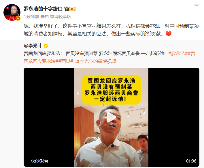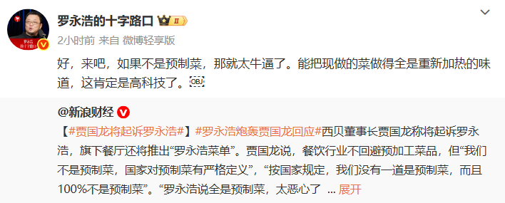 西贝贾国龙强硬表态起诉罗永浩,预制菜争议持续升级