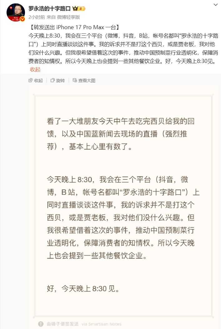 与此同时,罗永浩通过微博发文:"今天晚上8:30,我会在三个平台(微博,抖音,B站,账号名都叫罗永浩的十字路口)上同时直播谈谈这件事。我的诉求并不是打这个西贝,或是贾老板,我对他们没什么兴趣。但我很希望借着这次的事件,推动中国预制菜行业透明化,保障消费者的知情权。所以今天晚上也会提到一些其他餐饮企业。"预制菜行业规范化进程或因此加速。