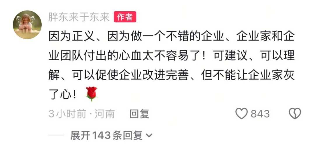 随后他回复网友自己发声理由:因为正义、因为做一个不错的企业、企业家和企业团队付出的心血太不容易了!可建议、可以理解、可以促使企业改进完善、但不能让企业家灰了心!