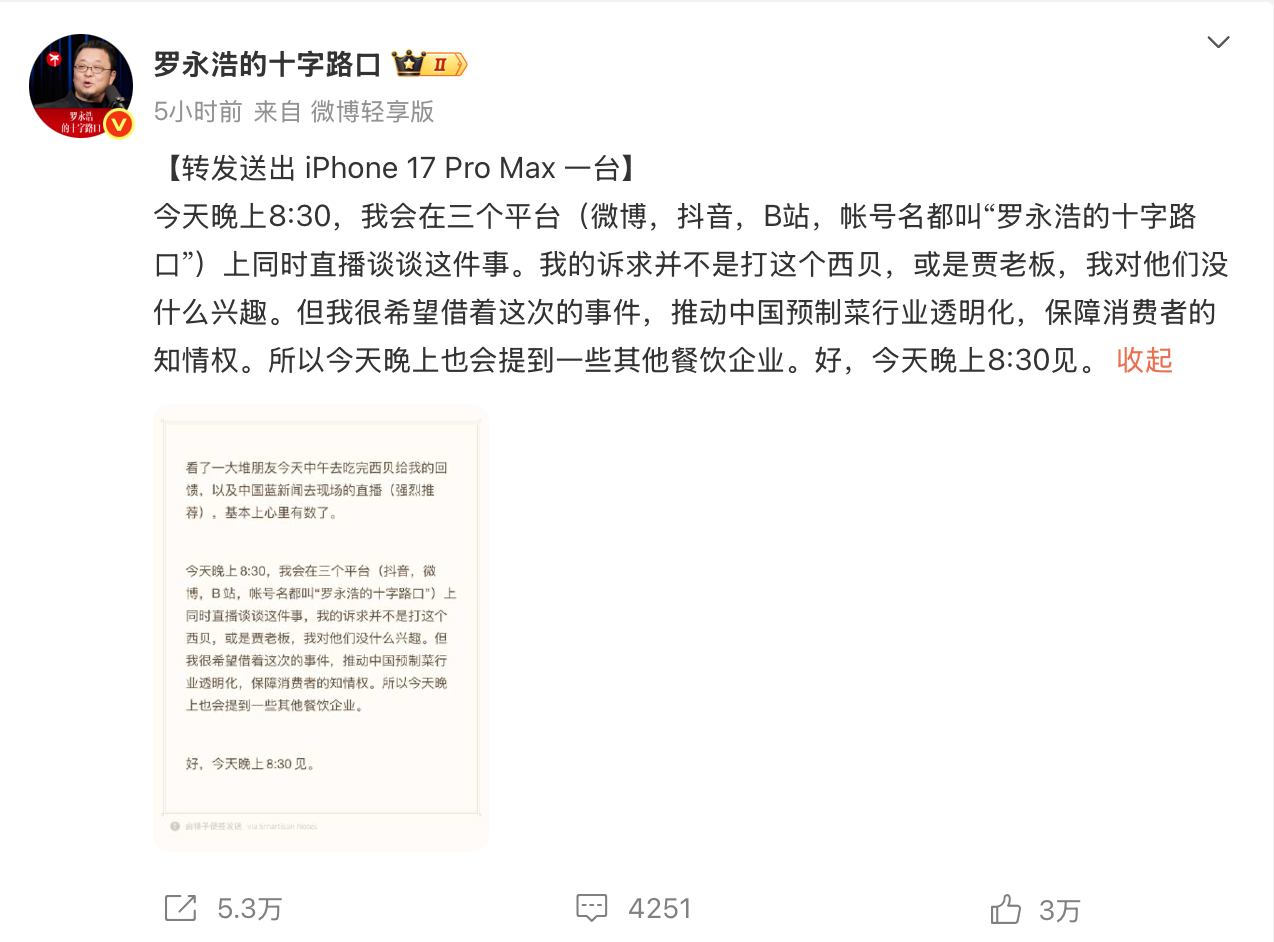 罗永浩直播炮轰西贝预制菜,推动行业透明化进程