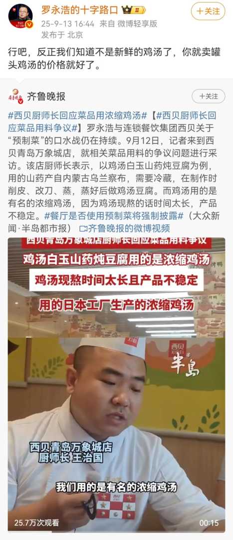 在今日转发《预制菜食品安全国家标准》草案过审消息后,罗永浩针对西贝持续发博,引发餐饮行业关注(预制菜标准)。