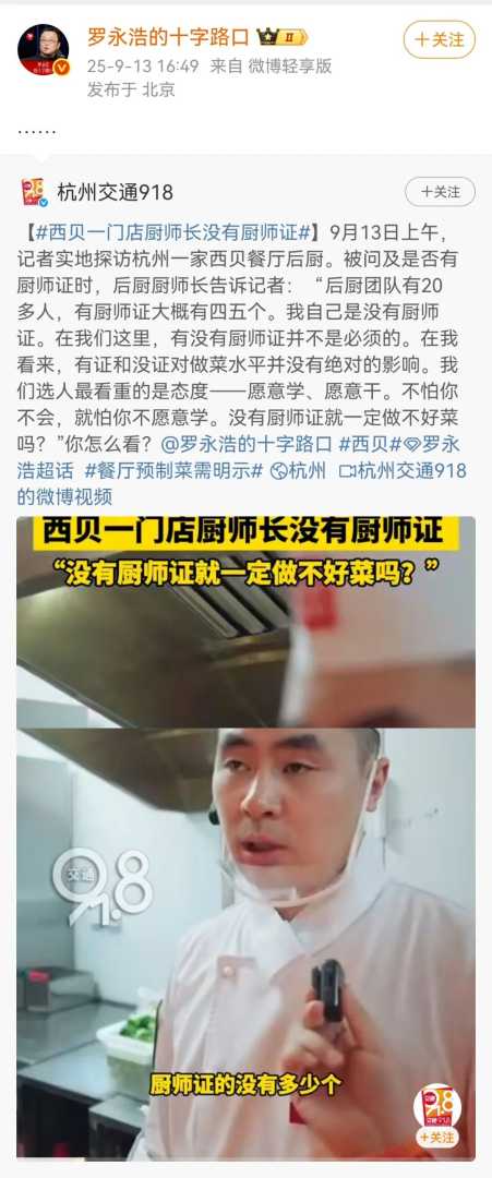 他转发包括“西贝厨师长回应菜品用浓缩鸡汤”“西贝一门店厨师长没有厨师证”等媒体报道,直指西贝食品安全问题(餐饮安全)。