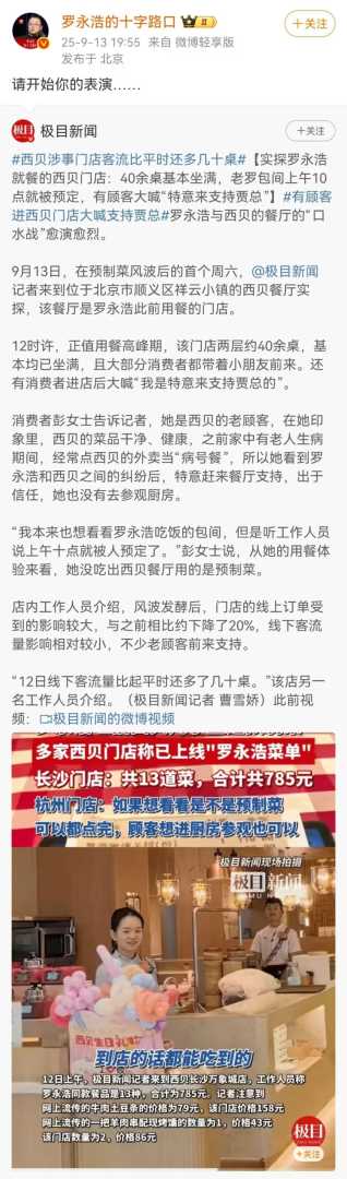 有记者实地来到罗永浩就餐的西贝门店,报道称40余桌基本坐满,老罗包间上午10点就被预定,有顾客大喊“特意来支持贾总”,罗永浩则表示:请开始你的表演......