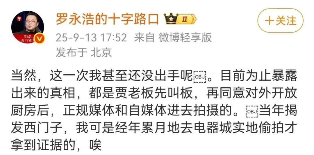 罗永浩还称在此次事件中他甚至还没出手呢。“目前为止暴露出来的真相,都是贾老板先叫板,再同意对外开放厨房后,正规媒体和自媒体进去拍摄的。当年揭发西门子,我可是经年累月地去电器城实地偷拍才拿到证据的,唉”。