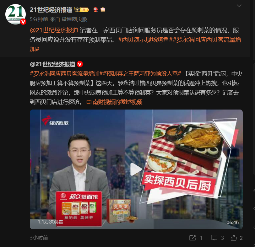 西贝门店回应预制菜争议 餐饮行业现做模式受关注