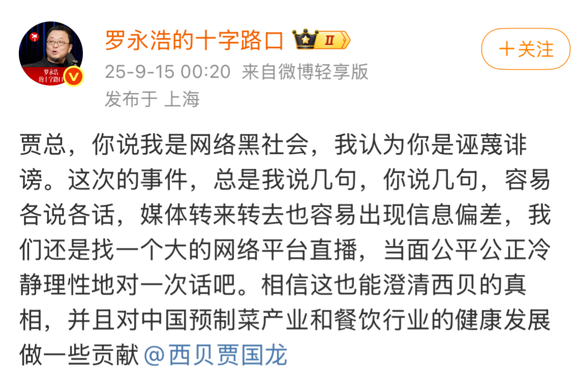 9月15日凌晨,罗永浩在社交平台发声,提议与西贝创始人贾国龙通过大型网络平台直播对话,以澄清西贝是否使用预制菜的真相,为中国预制菜产业和餐饮行业的健康发展贡献力量。
