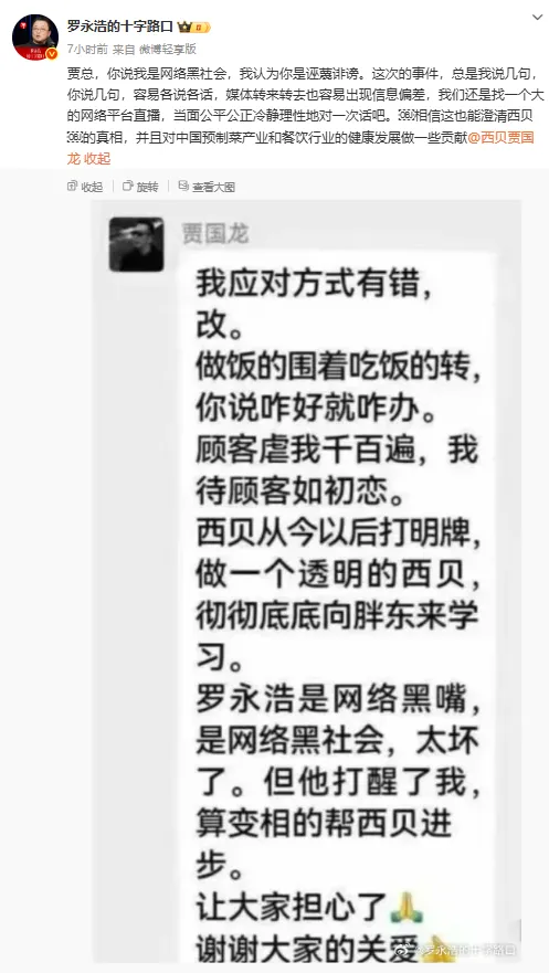 随后,罗永浩昨晚深夜再度在社交平台发声,并@西贝创始人贾国龙。他表示,在此次事件中,双方总是交替发声,各说各话,导致外界难以厘清真相,媒体在转述过程中也容易出现信息偏差。因此,他提议双方找一个大型网络平台进行直播,面对面公平公正、冷静理性地对话。