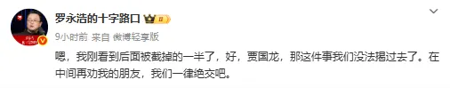 随后,罗永浩一度回应称,“贾国龙,那这件事我们没法揭过去了。在中间再劝我的朋友,我们一律绝交吧。”
