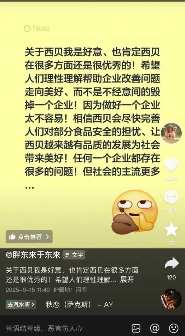 9月15日午间,于东来在社交媒体上表示,关于西贝他是好意,也肯定西贝在很多方面还是很优秀的!希望人们理性理解帮助企业改善问题走向美好,商业互助而非不经意间地毁掉一个企业!因为做好一个企业太不容易!相信西贝会尽快完善人们对部分食品安全的担忧,让西贝越来越有品质的发展为社会带来美好!商业互助是推动行业进步的重要力量。任何一个企业都存在很多的问题,但社会的主流是积极向上的。