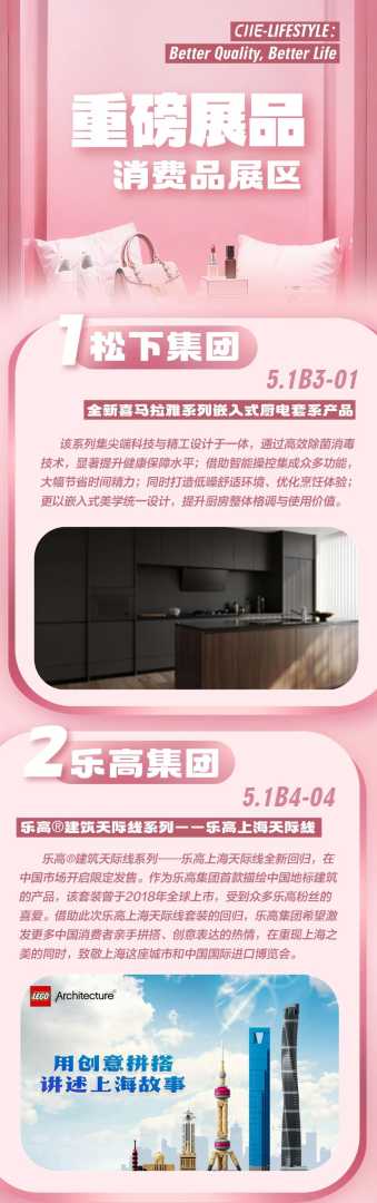 9月15日第八届进博会倒计时50天,消费品展区以“更高品质,更好生活”为主题,松下、乐高等国际品牌将首发新品。无印良品三度参展,展现深耕中国市场成果,未来将持续推动消费升级。