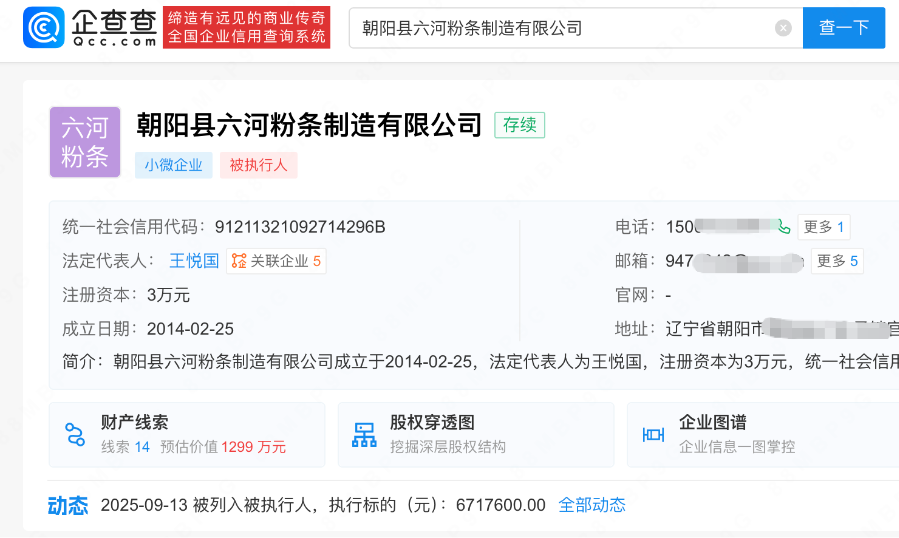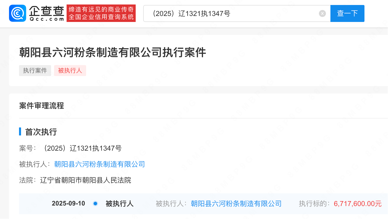 朝阳县六河粉条制造有限公司被执行671.76万余元,与“东北雨姐”直播售卖红薯粉条虚假宣传有关,雨姐传媒被罚165万元,直播电商乱象引市场监管关注。