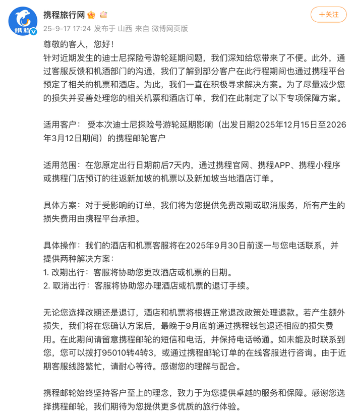 具体为:受本次迪士尼探险号游轮延期影响(出发日期2025年12月15日至2026年3月12日期间)的携程邮轮客户,在原定出行日期前后7天内,通过携程官网、携程APP、携程小程序或携程门店预订的往返新加坡的机票以及新加坡当地酒店订单。对于受影响的订单,携程将提供免费改期或取消服务,所有产生的损失费用由携程平台承担,保障游客权益。