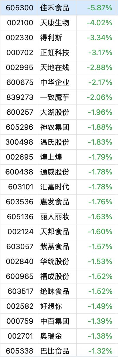 截至9月18日午间收盘,预制菜板块下跌0.47%,佳禾食品股价下跌5.87%,天康生物跌超4%,得利斯股价下跌超3%。另外,绿茶集团股价下跌1.43%。
