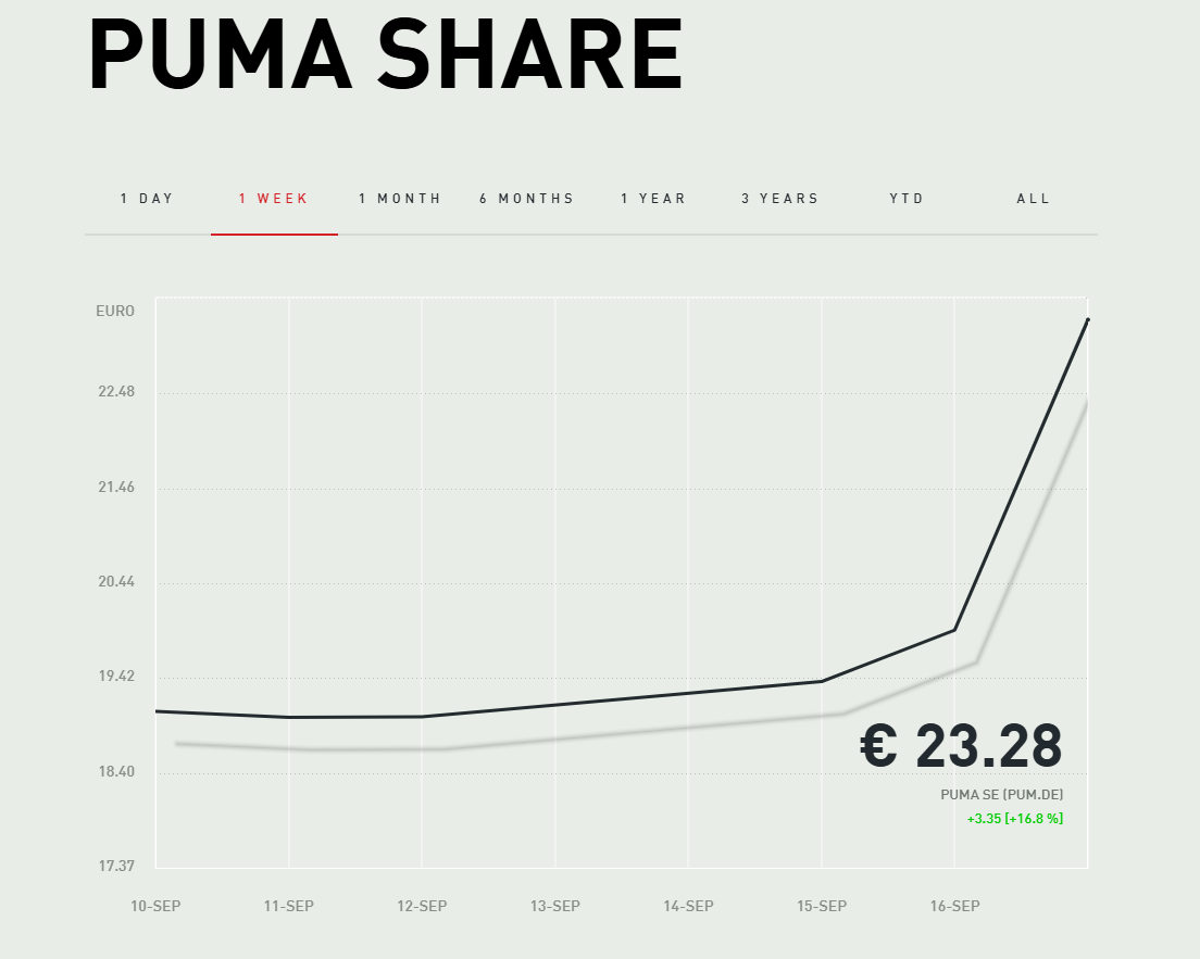 资本市场的反应最为真实。9月16日,受“阿迪达斯或成为彪马潜在收购方”的市场猜测影响,彪马股价应声上涨2.9%,终结多日低迷,17日彪马更是放量大涨16.8%。