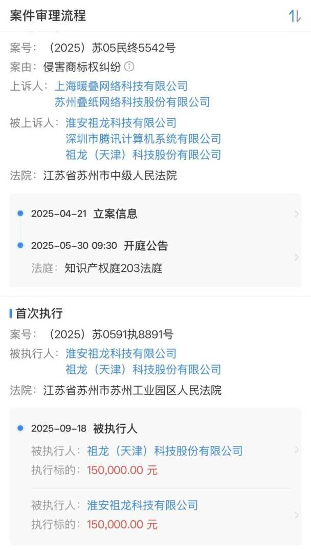9月19日,企查查APP显示,苏州叠纸网络科技股份有限公司、上海暖叠网络科技有限公司与祖龙(天津)科技股份有限公司的侵害商标权及不正当竞争纠纷有了最新进展:祖龙方面被法院裁定强制执行15万元。执行法院为江苏省苏州市苏州工业园区人民法院。此次事件源于2024年叠纸发现祖龙在微信广告平台将“闪耀暖暖”“无限暖暖”等注册商标设为搜索关键词,用户搜索“暖暖”相关词时优先展示祖龙旗下《以闪亮之名》内容,叠纸认为此举侵犯商标专用权并构成不正当竞争,于2024年3月提起诉讼。