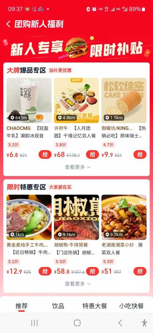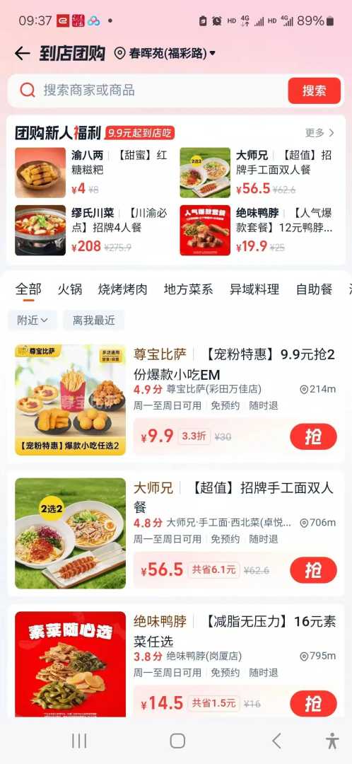 证券时报·e公司记者登录淘宝App深圳地区页面,发现“到店团购”入口已经上线,并针对新用户推出专属福利,例如尊宝比萨小吃套餐售价9.9元、绝味鸭脖人气套餐售价19.9元,团购优惠力度大。