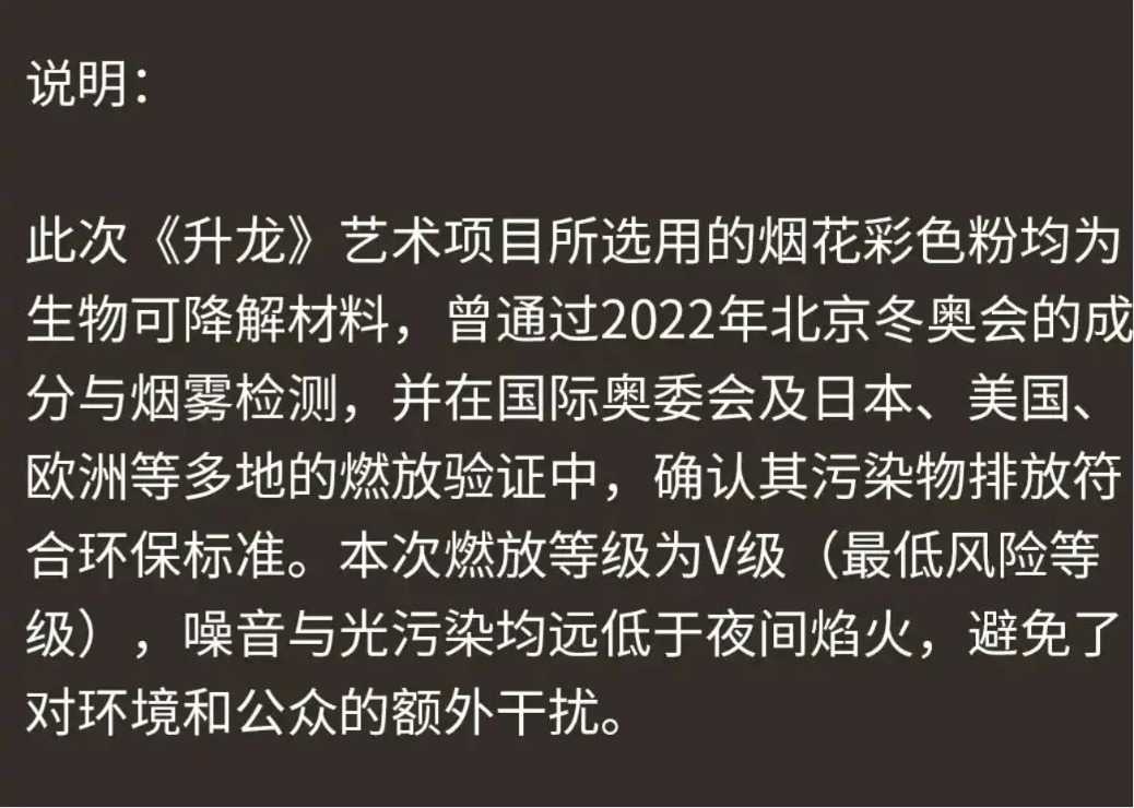 主办方称,此次《升龙》艺术项目所选用的烟花彩色粉均为生物可降解材料,污染物排放符合环保标准,且在生态保护层面做了预案,确保不留生态隐患。但即便如此,这场艺术活动在完成不久后还是引发了广泛争议,被众多网民质疑为“炸山秀”,环保争议持续发酵。