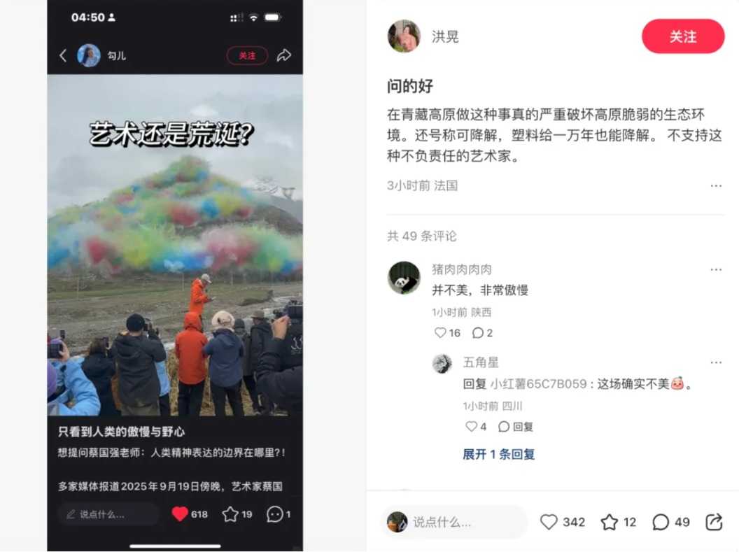 知名媒体人洪晃表示,在青藏高原做这种事真的严重破坏高原脆弱的生态环境,不支持这种不负责任的艺术家。另有大V认为,该活动表现出主办方极度的无知和傲慢,烟花放完后还会留下化学残留物,完全违背了自然保护的初衷。