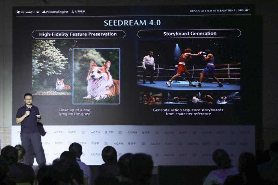 “未来影像”AI电影国际峰会的另一亮点,是关于AI技术在影视行业应用的分享。博纳影业集团影视制作副总经理曲吉小江介绍说,2023年底到2024年初,博纳正式成立了AIGC制作中心,并联合抖音、即梦AI推出了《三星堆:未来启示录》AI科幻短剧集,该系列第二季将打造为首部AI原生动画电影,深度应用火山引擎提供的Seendance、Seedream模型能力。此外,博纳影业还基于火山引擎多模态模型底座打造了“博卡短剧”平台,支持用户制作品质精良的短剧内容。