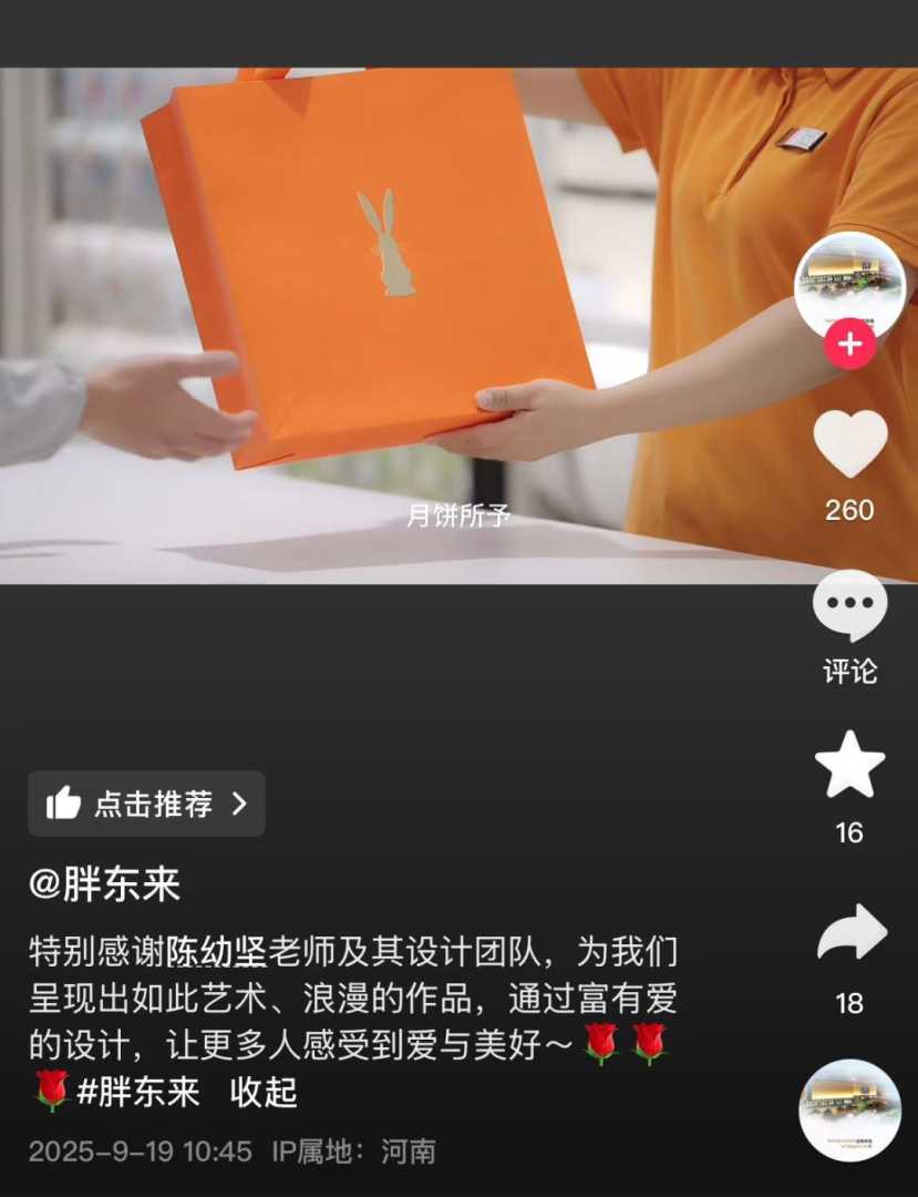 9月19日,胖东来官方账号曾发布作品,介绍自营月饼包装盒由中国香港陈幼坚团队设计。此外,工作人员还表示赏月礼盒系列(即包装盒是会跳动的兔子款)已经断货了,补货时间无法确定。据胖东来官方文件显示,DL自营月饼礼盒每盒售价97元至350元不等,价格透明合理。