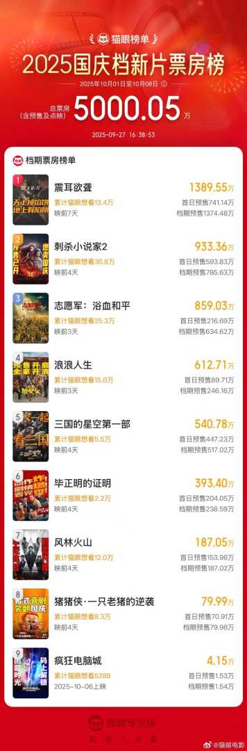 据猫眼专业版数据,2025国庆档新片预售总票房已突破5000万。《震耳欲聋》《刺杀小说家2》《志愿军:浴血和平》分列预售票房前三位,国庆档影片类型丰富,满足不同观众观影需求。