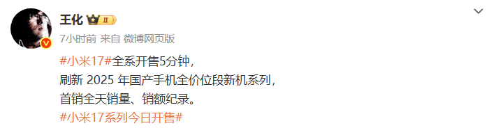 9月27日10时,小米17系列全渠道火热开售,掀起国产手机市场新热潮。当天上午,小米集团公关部总经理王化在微博上公开表示,小米17全系开售5分钟,便刷新2025年国产手机全价位段新机系列的首销全天销量、销额纪录,展现强劲市场号召力。