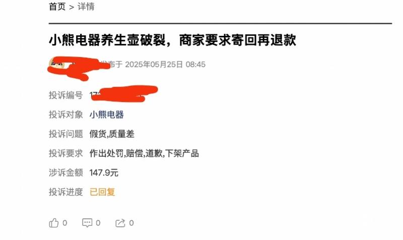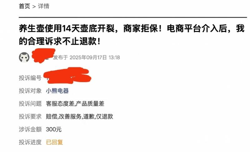 南都湾财社记者检索发现,在黑猫投诉平台有多条有关小熊电器养生壶的投诉,其中包括多起消费者表示正常使用过程中出现壶身无故破裂事件。如今年9月17日,有消费者投诉,其9月3日在电商平台购买了一款0.8L养生壶,该消费者强调:在严格遵循使用说明(使用时水量均在刻度线内)的前提下,仅正常使用了不到20次,于2025年9月17日上午9点30分左右,在加热煮茶过程壶底出现一道超过20厘米的裂纹。消费者表示,“此举存在严重安全隐患,裂纹导致沸水外溢,还烫坏了我放在一旁的一张显卡。”