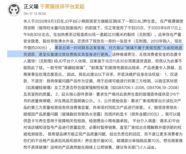 值得一提的是,在这两起投诉中,消费者均强调:第一时间小熊电器并没有同意退货退款,如上述消费者表示:事发后第一时间联系店家客服,对方竟以“玻璃不属于质保范围”为由拒绝退货退款,甚至反复建议其自费购买其壶身进行更换。