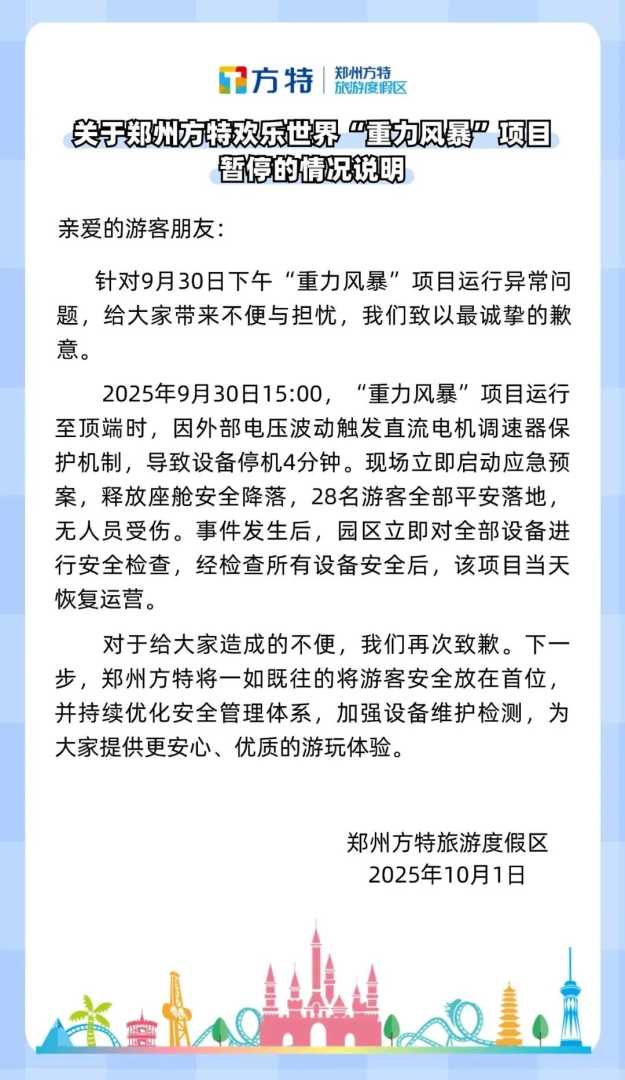 9月30日,郑州方特欢乐世界跳楼机因电压波动停机4分钟,28名游客平安落地。园区致歉并检查设备,将加强安全管理与维护检测,保障游客游玩安全。