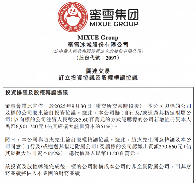 据悉,该投资及股权转让完成后,标的公司将构成蜜雪集团的非全资附属公司,而其财务业绩将并入集团的财务业绩。这对于蜜雪集团整体财务状况有着重要影响,关联交易的特殊性也使其备受市场关注。