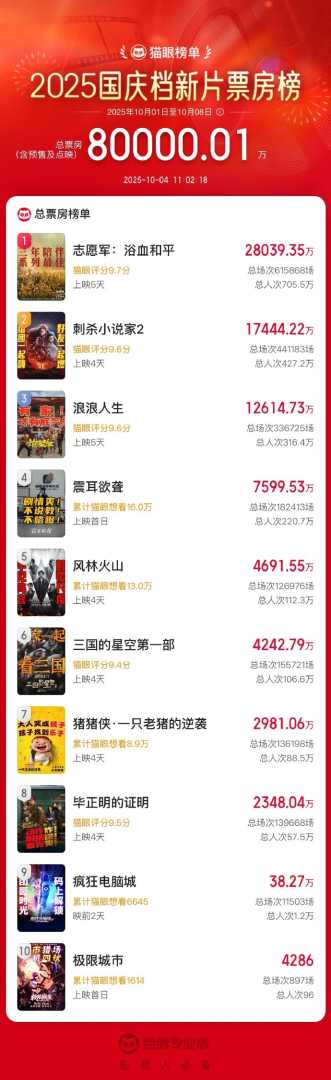 10月4日,据猫眼专业版数据,2025国庆档新片总票房突破8亿元,《志愿军:浴血和平》《刺杀小说家2》《浪浪人生》分列前三,展现电影市场蓬勃生机。