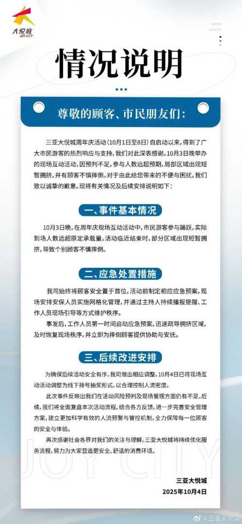 10月4日晚,三亚大悦城就3日晚现场互动活动因预判不足导致局部拥挤、顾客摔倒致歉,并表示将加强活动管理,提升顾客体验,引发公众对活动安全的关注。