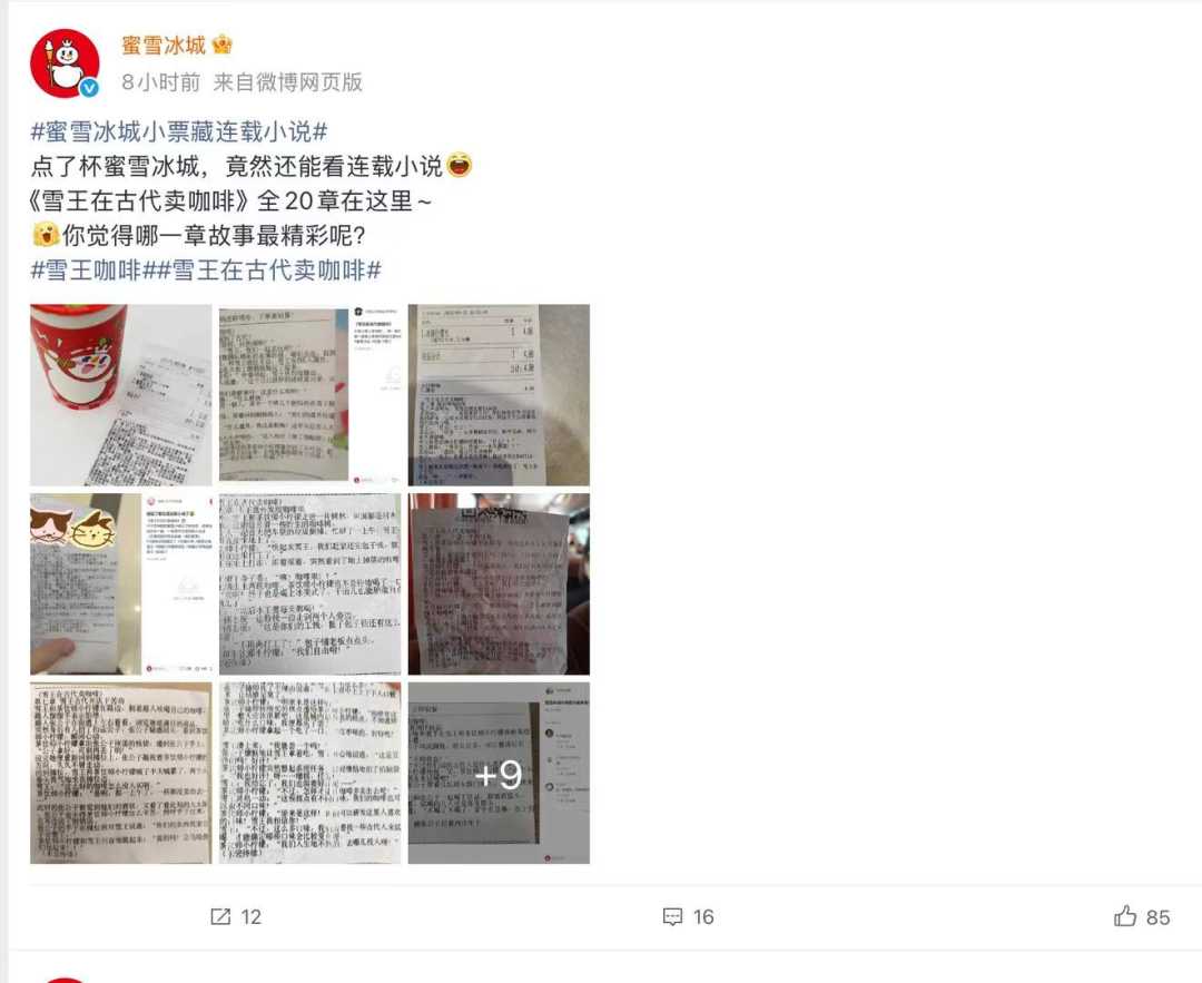 近日,有网友在社交平台发帖称,“蜜雪竟然也开始写小说了!”其在购买蜜雪冰城时发现小票上印有连载小说,篇名为《雪王在古代卖咖啡》,这部品牌互动小说讲述了“雪王”与伙伴小柠檬穿越至古代经营咖啡店的故事,成为品牌营销新亮点。