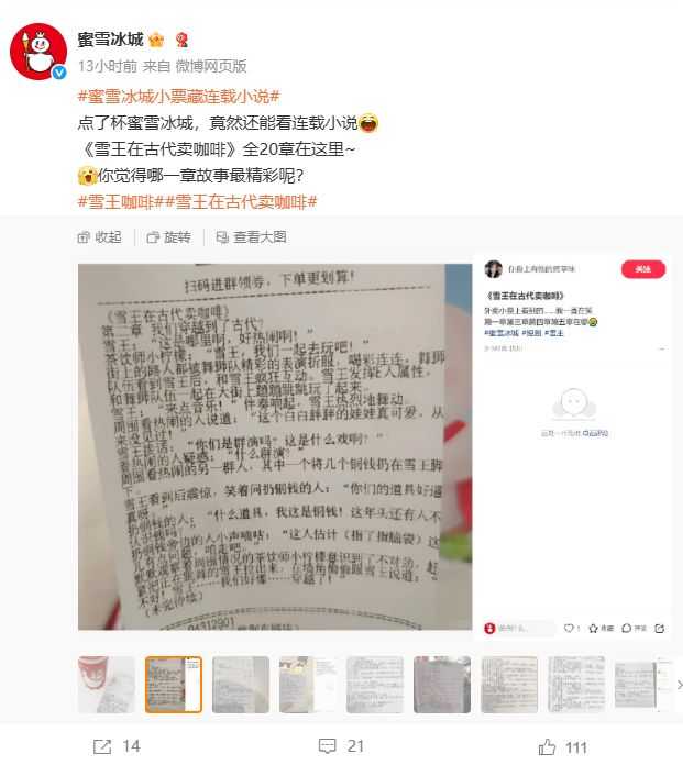 近日,有网友在社交平台发帖称,“蜜雪竟然也开始写小说了!”其在购买蜜雪冰城时发现小票上印有连载小说,篇名为《雪王在古代卖咖啡》,讲述了“雪王”与伙伴小柠檬穿越至古代经营咖啡店的故事。这一创意互动活动迅速引发了消费者的广泛关注,成为品牌营销的一大亮点。