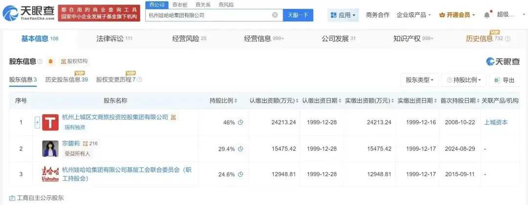 信息显示,“娃小宗”的商标目前归宏胜集团所有,商标申请日期显示为2025年5月。据悉,娃哈哈商标不属于宗馥莉一个人。工商登记信息发现,娃哈哈股权呈现出三方制衡的格局:杭州市上城区文商旅投资控股集团有限公司(国资)持股46%。宗馥莉继承宗庆后,个人持股29.4%。基层工会(职工持股会)持有24.6%。