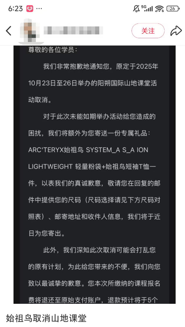 始祖鸟再陷活动调整风波。南都·湾财社记者注意到,近期多位已报名“阳朔国际攀岩山地课堂”的学员在社交平台发帖称收到始祖鸟官方发送的短信及邮件:原定于2025年10月23日-10月26日举办的阳朔国际攀岩山地课堂取消。始祖鸟将退还课程报名费,并为学员提供原定行程的差旅费用报销及专属礼品,这一调整引发了广泛关注。此次活动取消(SEO关键词1)引发了户外运动爱好者的热议。