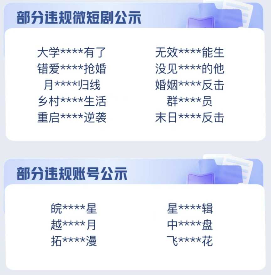 公告中公示了部分违规微短剧以及违规账号,其中,部分违规微短剧包括《大学XXXX有了》《错爱XXXX抢婚》《月XXXX归线》《乡村XXXX生活》《重启XXXX逆袭》等;部分违规账号包括:皖XXXX星、越XXXX月、拓XXXX漫等。这些违规内容不仅违背公序良俗,也损害了观众的权益。