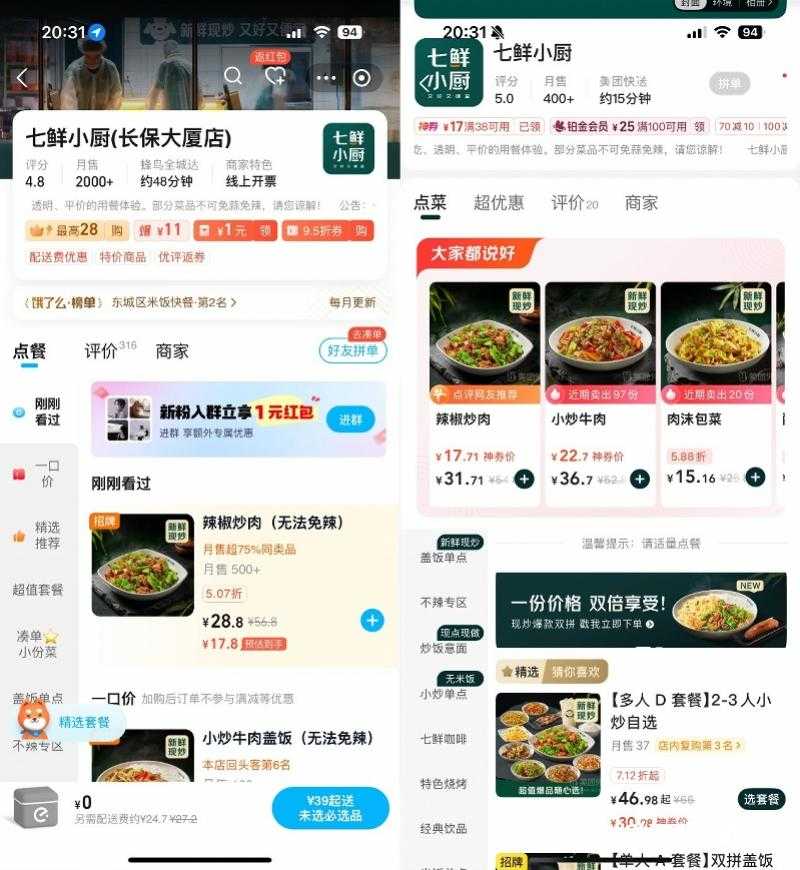 七鲜小厨在两个平台均可使用大额红包,优惠力度大。2-3人食用的多人D套餐,在美团的券后价格为30.98元起,饿了么为33.8元起。招牌菜辣椒炒肉,在美团的到手价为17.71元,饿了么到手价为17.8元,而在京东外卖的券后到手价为13.8元,价格差异明显。