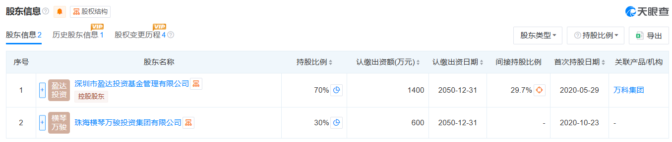 股权全景穿透图显示,海南万骏管理服务有限公司由万科旗下深圳市盈达投资基金管理有限公司以及珠海横琴万骏投资集团有限公司分别持股70%、30%。这一股权结构情况或对合同纠纷案件产生一定影响,后续案件走向值得持续关注。