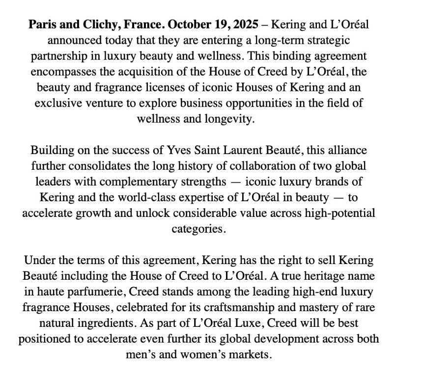 当地时间10月19日,欧莱雅集团与开云集团宣布建立长期战略合作伙伴关系,总估值40亿欧元,涵盖Creed品牌收购、品牌美妆与香水授权及健康长寿领域合作,将加速品牌全球化布局。
