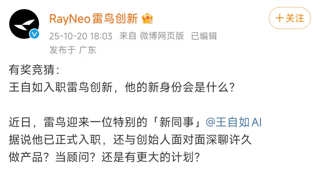 10月20日雷鸟创新发文,王自如入职工号00678071。雷鸟创新将举办活动,王自如与创始人对谈。雷鸟在AR/VR领域有投入,市场排名靠前。王自如还谈及在格力工资等情况。