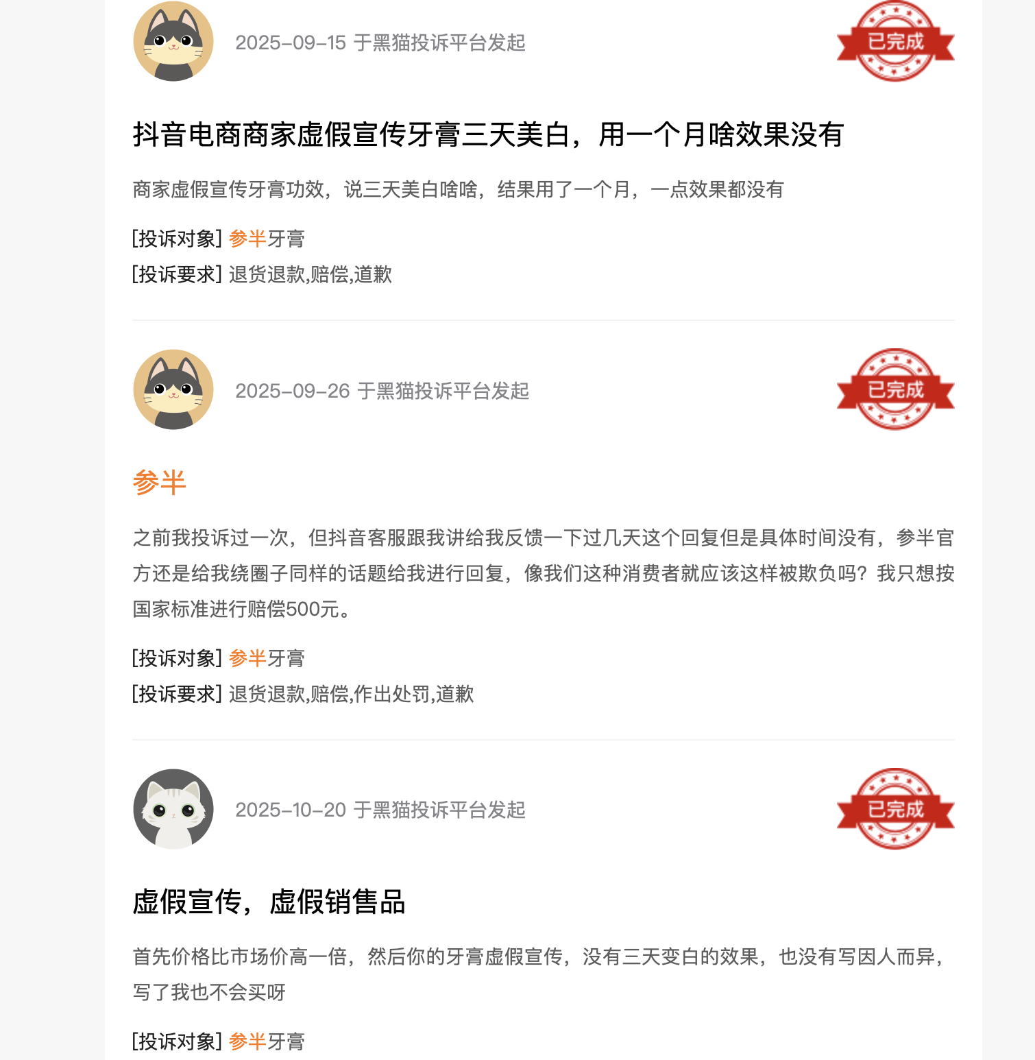 有消费者投诉参半牙膏“三天美白是虚假宣传”,称在直播间购买的牙膏用了一个月效果甚微,客服回应“美白效果因人而异”。黑猫投诉平台上,关于参半牙膏虚假宣传“美白”功效的投诉多达380条,显示出消费者对美白牙膏效果的普遍关注与不满。