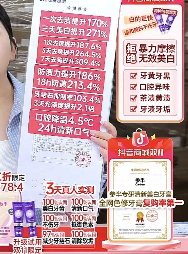 接着,主播用“二倍速”的激扬语气介绍这款牙膏的功效,“一次去渍提升170%,三天美白提升271%。”然而,这种宣传方式却引发了涉“虚假宣传”的质疑,参半牙膏的美白效果究竟如何呢?