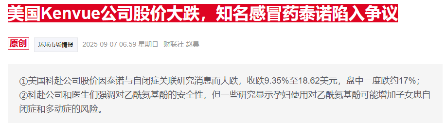 财联社先前提到过,特朗普在今年9月的一场白宫新闻发布会上说,孕妇不应服用止痛药泰诺,其所含成分“对乙酰氨基酚”与孩童患自闭症相关。据统计,美国每年约有超过1亿人使用对乙酰氨基酚。科赴随后强烈驳斥了这一指控,医学界也普遍认为,泰诺仍是孕妇缓解疼痛和退烧的最安全、也是唯一可选的药物之一。