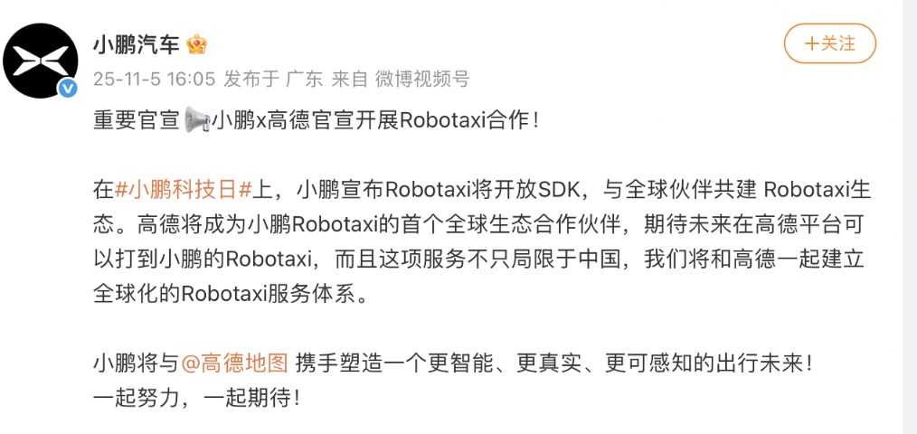 小鹏还宣布,高德将成为小鹏Robotaxi的首个全球生态合作伙伴,未来在高德平台就能打到小鹏的Robotaxi,且这项服务不局限于中国,将拓展至全球市场。