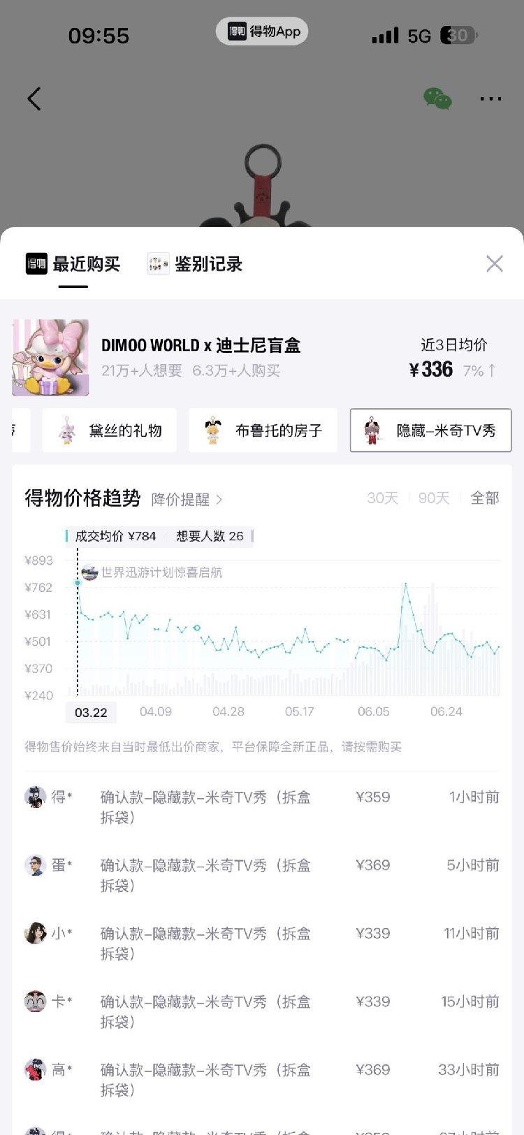 据悉,今年3月,DIMOO推出了与迪士尼联名的首款搪胶盲盒产品,该产品包括6个基本款和1个隐藏款。得物App数据显示,隐藏款“米奇TV秀”价格由179元上涨至784元,溢价3.4倍,截至目前,隐藏款市场价为359元,仍有1倍的溢价。由于联名IP产品较少出现补货的情况,因此市场价格一般较为稳定,今年6月,该系列隐藏款价格甚至迎来了一波增长,市场价格逼近发售初期的市场价格,盲盒收藏价值凸显。