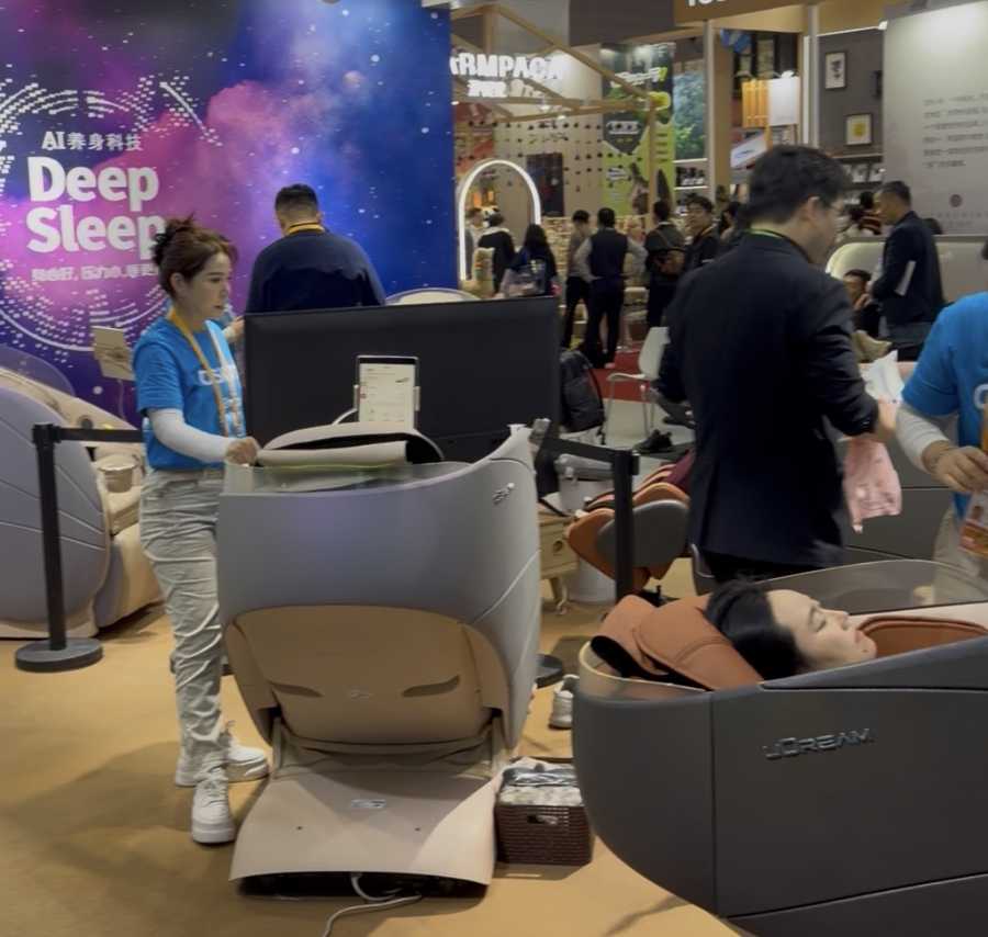 在进博会玩出了很多花样的,还有习以为常的家具:椅子。主营按摩椅的傲胜工作人员表示,来体验按摩椅的观众,大部分都是年轻的上班族。为了迎合年轻人的消费需求,傲胜带来了全新的“工学按摩椅”品类,结合了办公工学椅和按摩椅的功能,比传统按摩椅更轻量化,同时取消电源线改用充电电池,灵活适配居家办公的场景需求。
