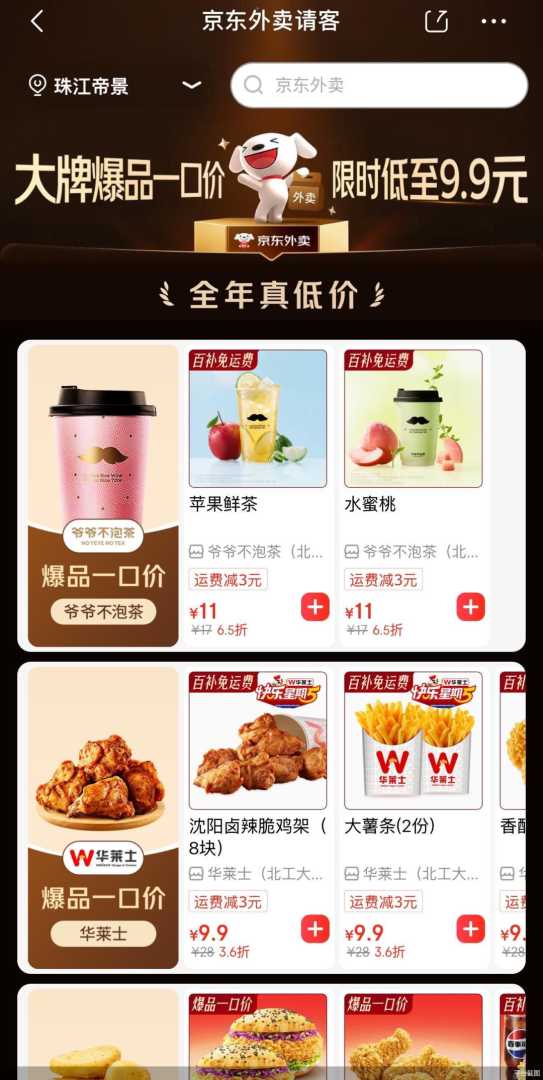 外卖新秀京东外卖也同步为菜单贴上“双11”标签。北京商报记者注意到,京东外卖联合餐饮品牌首次参与京东11.11,不仅很多餐饮品牌的点餐页面上新增“双11狂欢”这一栏,平台也推出“请客吃外卖,爆品9块9”活动,爷爷不泡茶、华莱士、塔斯汀、瑞幸咖啡、蜜雪冰城等饮品和快餐品牌参与其中。即时配送体系重构了餐饮消费链路。